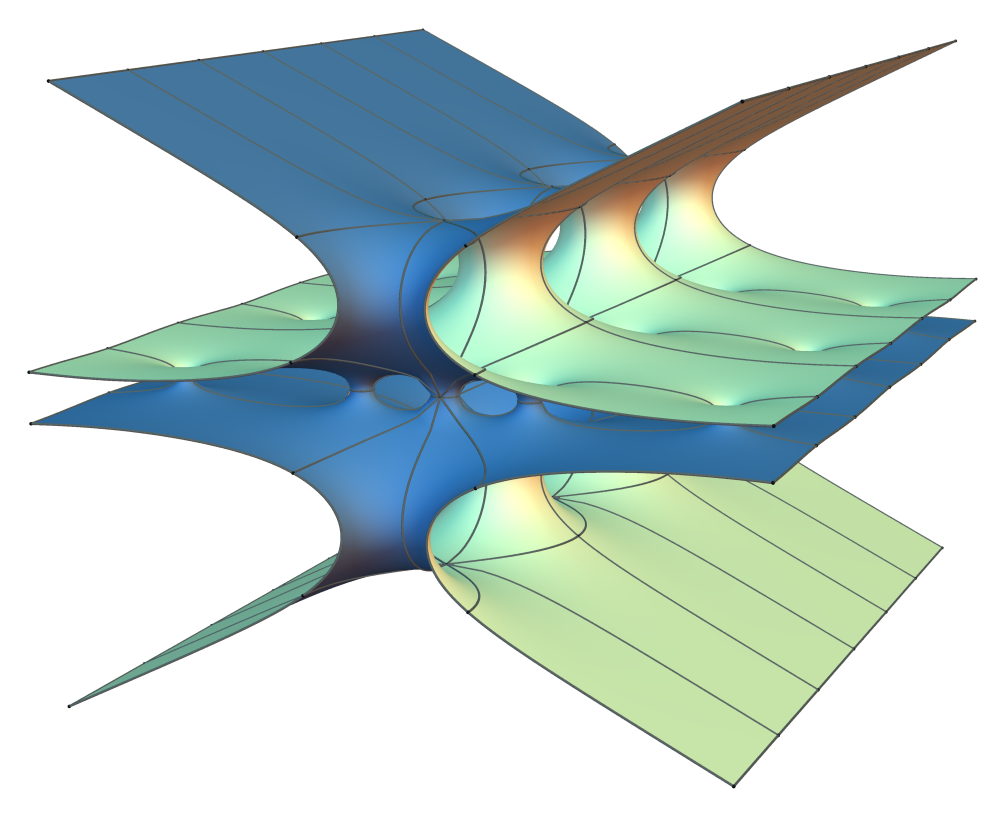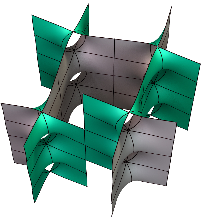 These two papers show, respectively, two new 2-dimensional families of triply periodic minimal surfaces of genus three, which can be seen as orthorhombic deformations of Schwarz’ D and H surfaces. These families are exceptional since they do not belong to Meeks’ 5-dimensional family, yet the 1-dimensional “intersections” with Meeks family exhibit singularities in the moduli space of triply periodic minimal surfaces of genus three. Picture on the left compares a new surface with the classical Schwarz tD surface. See Matthias blog post for a gentle introduction.